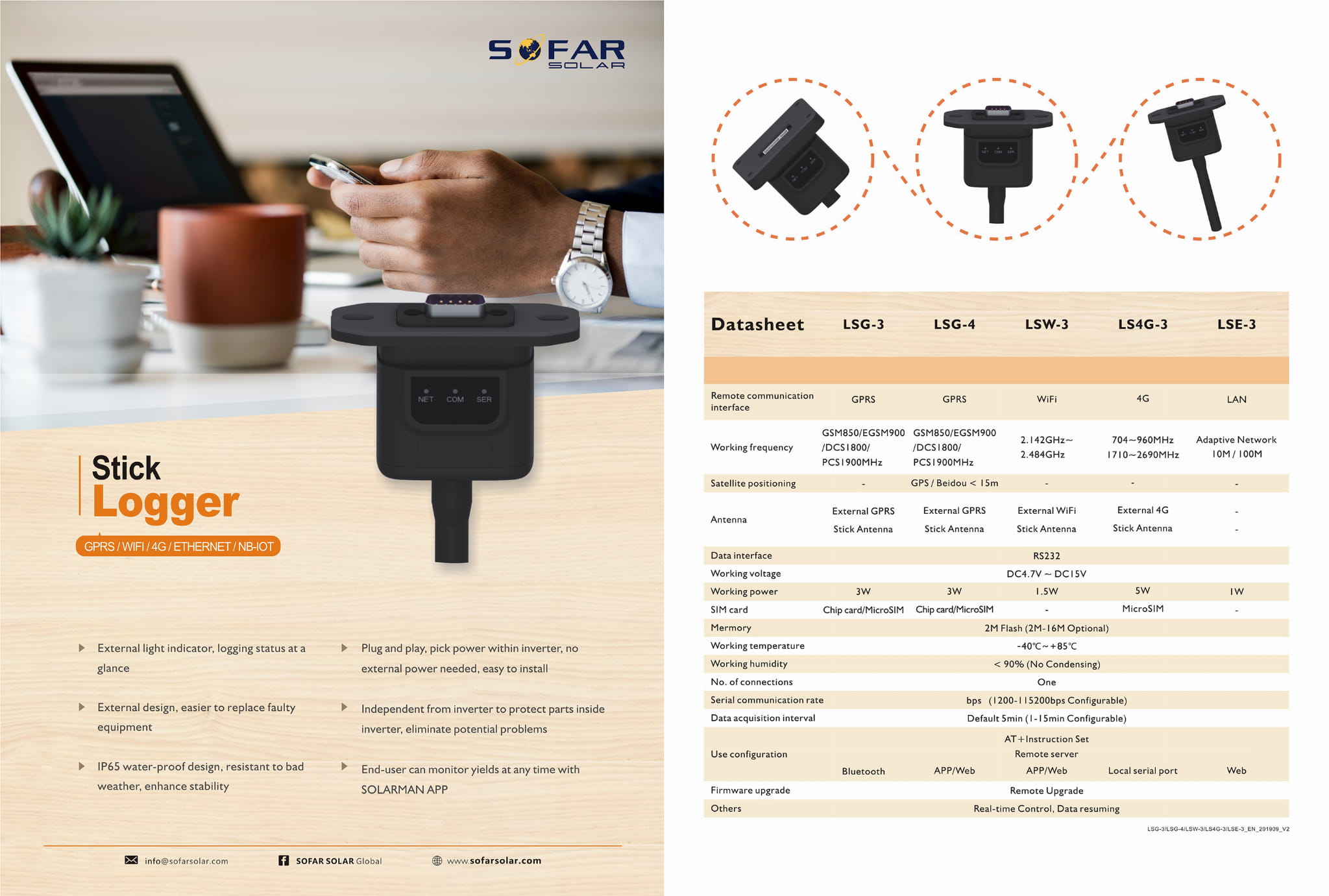 MKomunikační modul ETHERNET STICK LAN pro hybridní měniče SOFAR SOLAR LSE-3 SOFAR - modul určený pro měniče SOFAR SOLAR. Zajišťuje komunikaci prostřednictvím rozhraní ETHERNET a je vybaven externím LED indikátorem, který informuje o jeho aktivitě. Verze modulu PLUG and PLAY umožňuje, aby zařízení fungovalo ihned po zapojení do sítě, aniž by bylo nutné instalovat další soft W are. Zařízení spolupracuje s aplikací SOLARMAN, která umožňuje nepřetržitě sledovat jeho provoz. Konfigurace zařízení probíhá prostřednictvím W ebového prohlížeče.